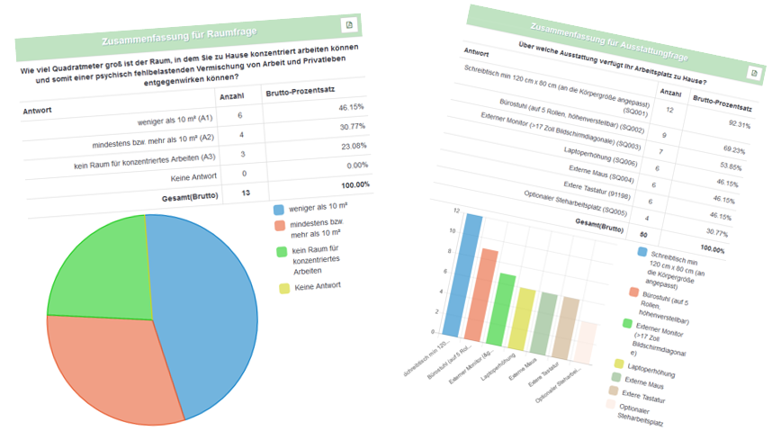 Ein erstes Ergebnis auf Basis der beantworteten Fragen wird sofort automatisch ermittelt und angezeigt, noch bevor der Fragebogen abgeschickt wird. Es kann nach Absprache mit dem Auftraggeber auch evaluierte Produktempfehlungen für ergonomische Büromöbel oder Zubehör enthalten, die zur Finanzierung unseres Services beitragen und die Gesamtkosten senken.
