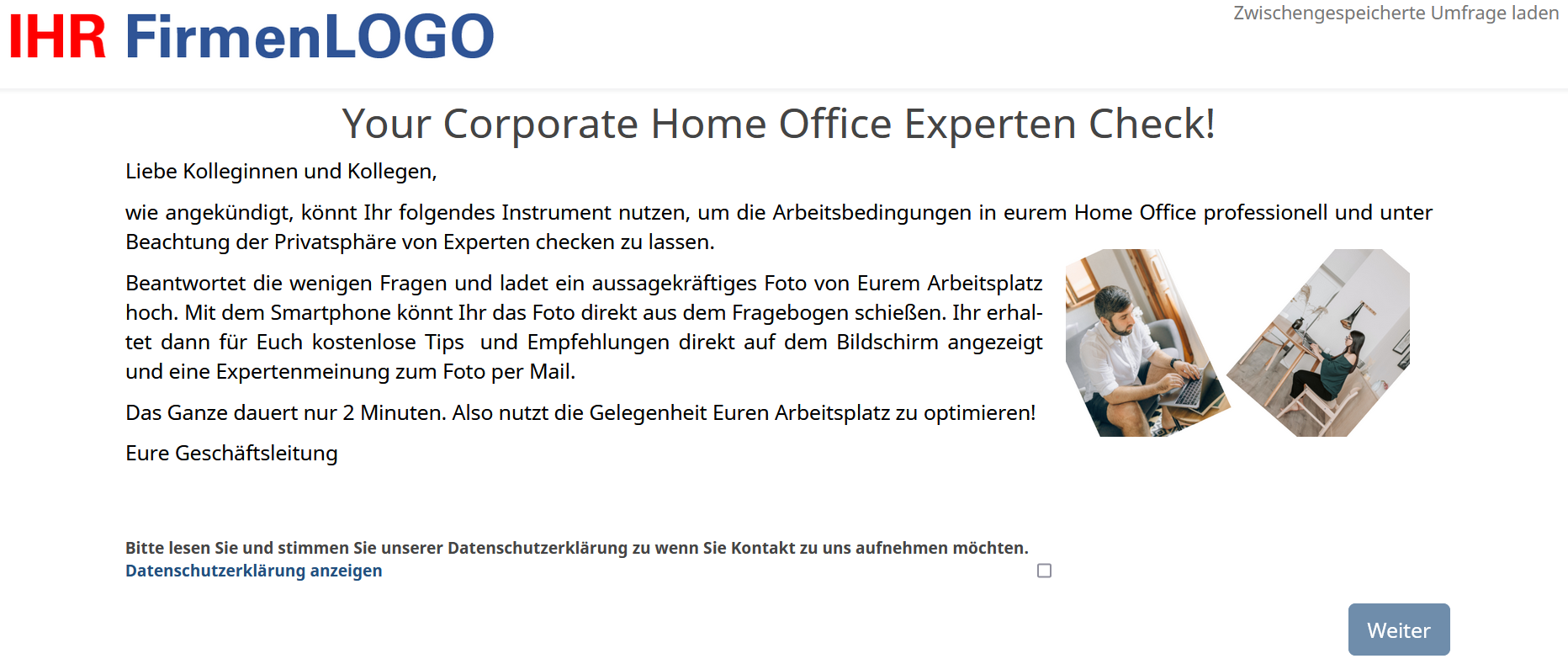 Beschäftigte scannen mit der Kamera ihres Smartphones, den speziell für ihre Firma erstellten QR-Code und beantworten 5 einfache Fragen zum Arbeitsplatz im Homeoffice. Optional besteht sogar die Möglichkeit, mit einem Klick den eigenen Homeoffice Arbeitsplatz zu fotografieren, das Foto auf den Server hochzuladen um eine Expertenmeinung einzuholen. Die Expertise kann, je nach Bedarf, durch innerbetriebliche Fachkräfte für Arbeitssicherheit, beauftragte überbetriebliche Dienste oder durch unsere Arbeitsschutzexperten erfolgen.